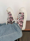 •    Design Elements: Unique Plaid Pattern, Chunky Sole Design, White Lace-Up Closure